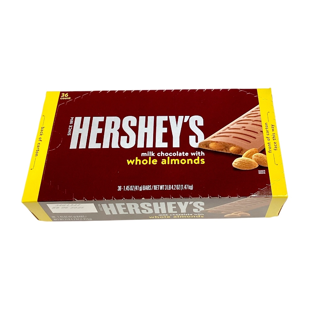 Milk chocolate bar with whole almonds, perfect for a sweet and nutty snack anytime.
