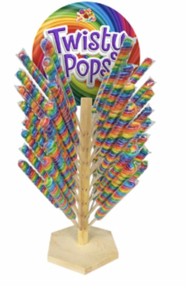 Delicious twisty lollipops beautifully displayed on a wooden tree — perfect for parties, candy tables, or gifting.