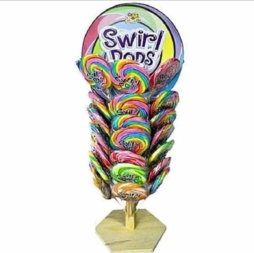 • Swirl Pops — 48 vibrant, 3oz lollipops beautifully displayed on a wooden tree for a playful candy presentation.