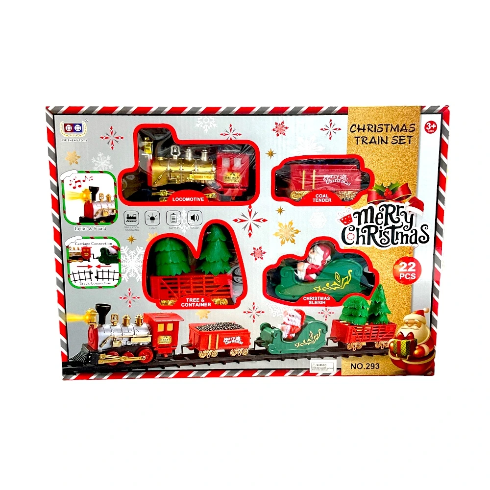 Includes a Christmas-themed train set with track and cars.