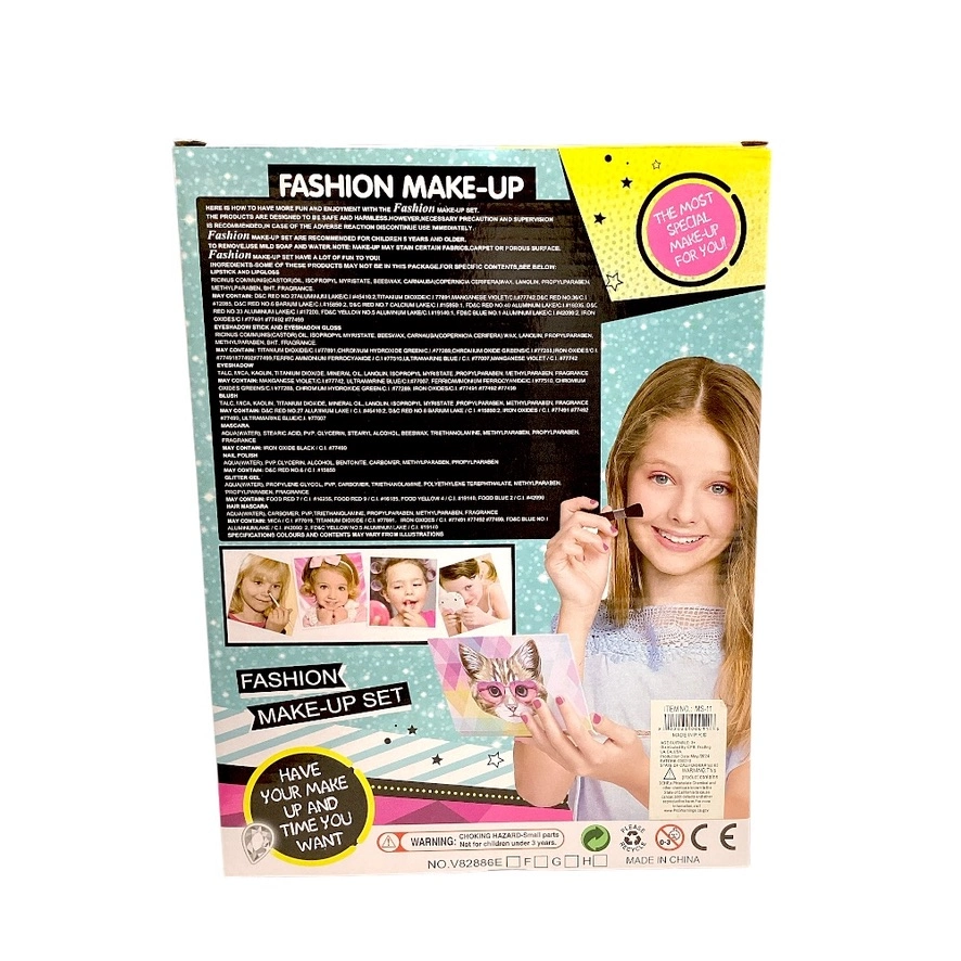 Includes a cosmetic set with brushes, lip colors, eye shadows, and fun accessories.