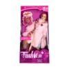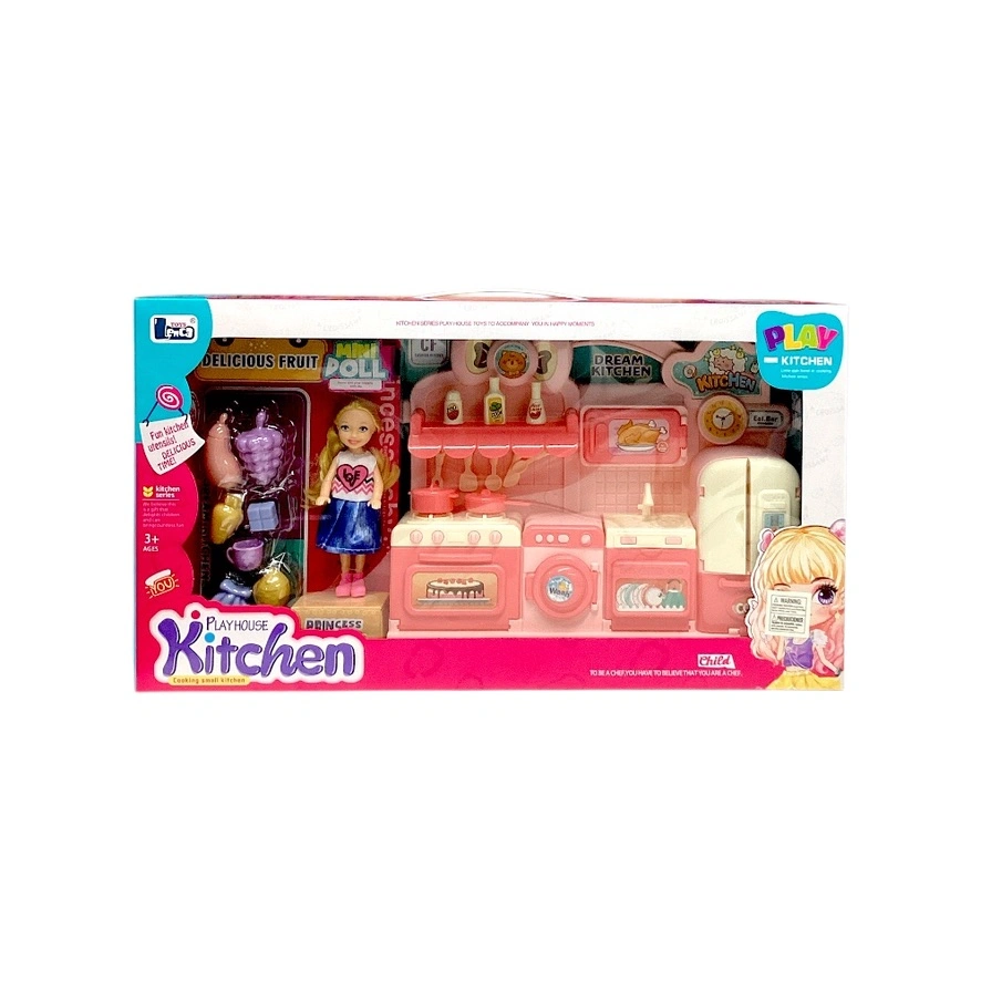 Playhouse-style kitchen set complete with a doll and cooking accessories. Encourages creativity, pretend cooking, and nurturing role play.