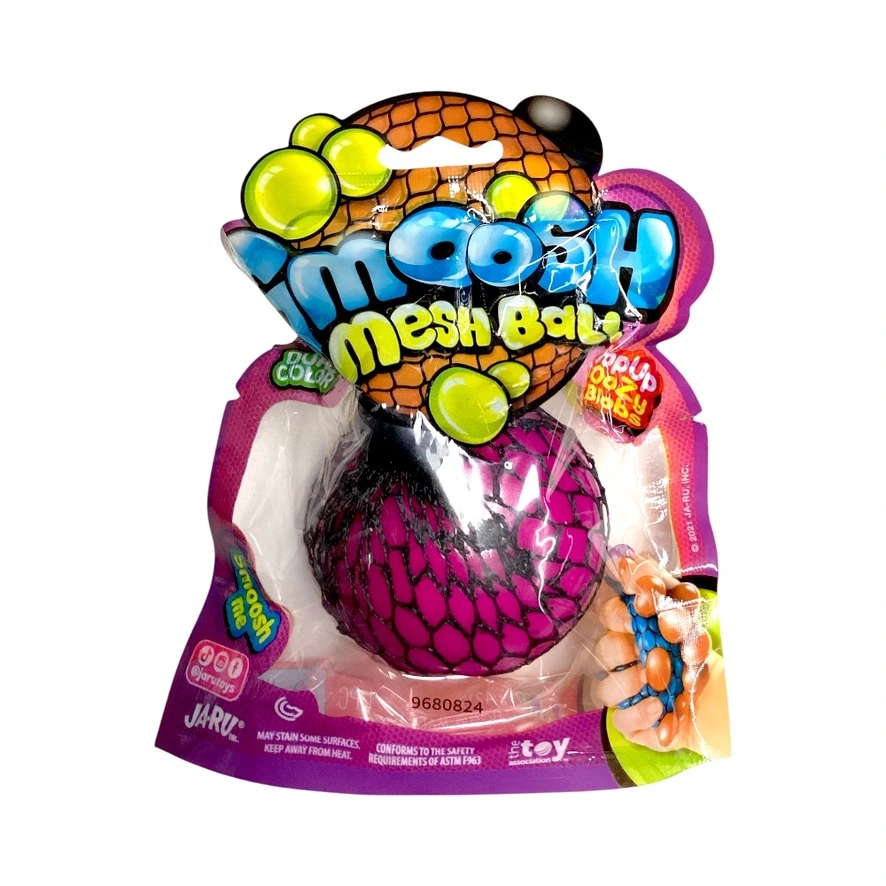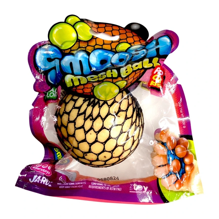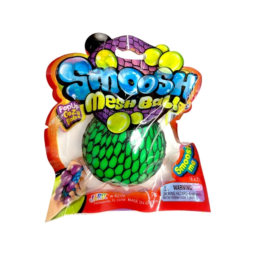 Features a colorful mesh ball that bulges and changes shape when squeezed.