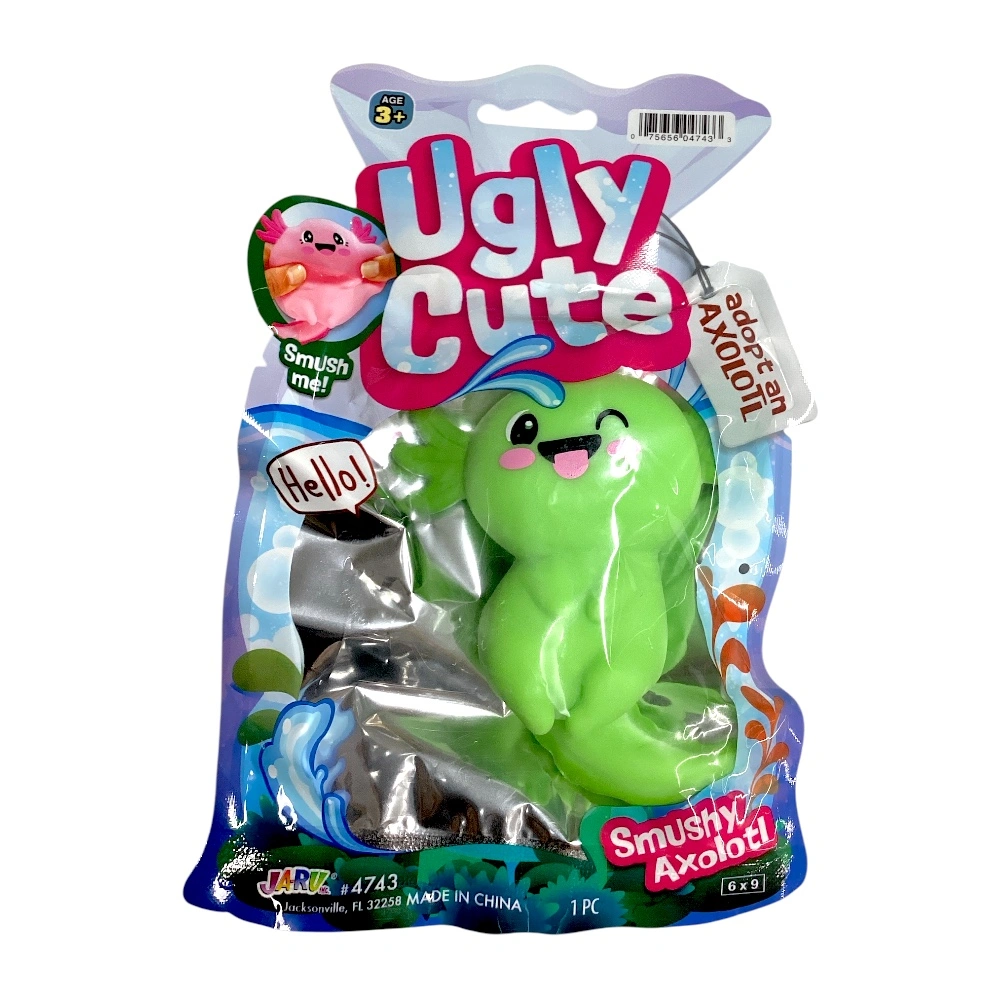 Features a soft, smushy axolotl toy with a delightfully silly design.